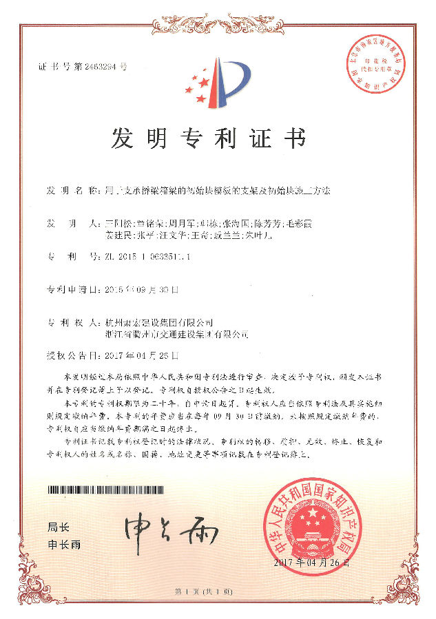 衢交集團2107年度榮獲2項國家專利衢交集團2017年榮獲1項國家發(fā)明專利、1項國家實用新型專利。分別是《用于支承橋梁箱梁的初始塊模板的支架及初始塊施工方法》獲發(fā)明專利(專利號:ZL201510633511.1)、《施工橋梁T梁